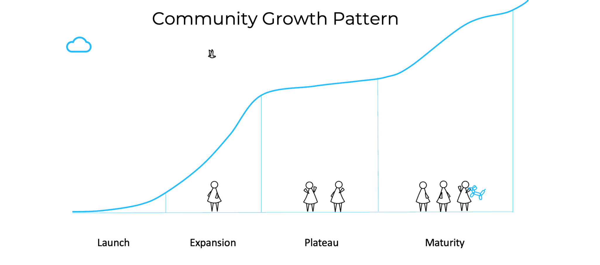 An understanding of the growth pattern will enable you to plan and strategize. Not every community grows at the same pace, some will always be slow burns - especially those with limited specialist appeal and few resources. Others expand rapidly achieving tens of thousands of members in the first month. Setting realistic targets and understanding community growth patterns is vital to managing stakeholder expectations. Communities go through four phases; launch, expansion, plateau, and maturity.
